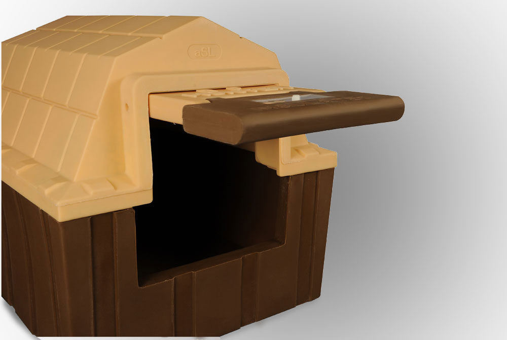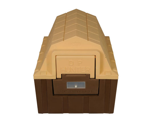 Keep your dog warm in the winter and cool in the summer with the DP Hunter Insulated Dog House. Floor is sloped and has a drain hole to make cleaning a breeze, just hose down and water runs out. Makes a beautiful addition to your backyard while keeping your dog clean, warm and comfortable. Floor is raised 5.5 inches from floor to door to provide a dry and warm bedding area. Constructed from LLDPE resin inside that is UV-8 protected and outside walls with foam (Styro/EPS) inside. Removable bottom half door for initial training. New heater portal (provides for the heater's electrical cord to directly exit the rear of the house) and keeps the dog from tripping over the cord. DP Hunter Insulated Dog House Heaters sold separately.